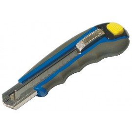 Cutter professionnel. Corps ABS et gomme anti-dérapante. Avec blocage automatique de la lame. Molette de serrage pour arrêt total de la lame. Chargeur interne avec 6 lames 18 mm auto cassantes.