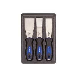 3 grattoirs renforcés avec lames allant de 32 à 50 mm de large dont 1 lame coudée..