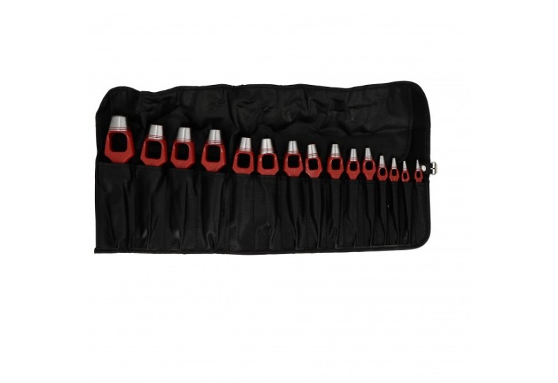 Les 15 emporte-pièces sont présentés dans une pochette de rangement structurée, maintenant chaque outil à sa place et protégeant les tranchants entre les utilisations. Ce conditionnement facilite l'identification rapide du bon diamètre sur le poste de travail et assure la longévité du jeu complet.