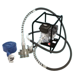 L'ensemble complet inclut le groupe moteur GEH APC avec moteur Honda, la pompe à câble de 6 m, un tuyau de refoulement de 10 m (Ø 75 mm), un collier de serrage et les raccords nécessaires.