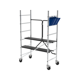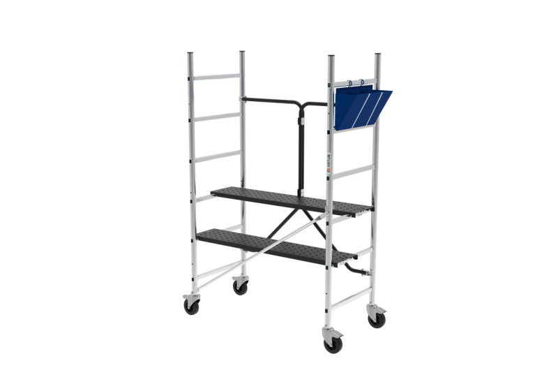 Contrairement aux échafaudages classiques à un seul niveau, le Synchro dispose de 2 plateaux antidérapants. Vous pouvez les aligner pour créer une grande surface de travail, ou les placer en décalé ("escalier") pour peindre une cage d'escalier ou atteindre des zones difficiles d'accès tout en gardant du matériel à portée de main sur le niveau inférieur.