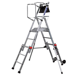 La sécurité, au cœur de la conception DUARIB, est omniprésente. La protection de l'opérateur est assurée par des garde-corps latéraux et des sangles. Le plancher (0,50 x 0,40 m) est doté d'une surface et de plinthes intégrées antidérapantes, tout comme les barreaux, minimisant les risques de glissade. De plus, ses stabilisateurs rabattables à réglage millimétrique et sa capacité à s'installer sur des surfaces en dénivelé offrent une assise parfaite en toutes circonstances.